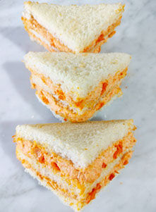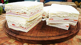 Triples rebanadas de pan de molde, rellenos con pasta ave pimiento o ave palta.