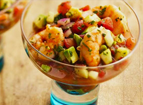 Reineta, cebolla morada, cilantro, camarón pimentón rojo y verde, limón.